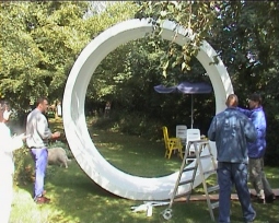 Errichtung des Basisrings für die Kuppel. Der Ring besteht aus 4 PVC- Platten welche mit Spanngurten in Form gebracht wurden und anschliessend auf die Ringe